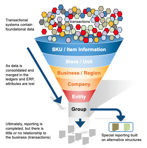 As these systems grew in size and stature, speed and storage became concerns. Transactional information was further consolidated and merged with similar data for reporting. Later in the reporting cycle, final adjustments and allocations are often 'top-sided', eliminating any alignment that may have existed between the reported numbers and those in the transactional systems.